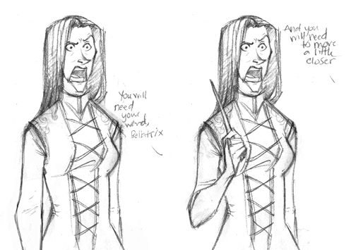 This is not relevant to Les Misérables, but if you’re on this blog for trenchant literary analysis, it’s better that you find out now. In the halcyon days of Potter fandom, decades before the TERF queen went mask-off and ruined things for us, an animator who went by Makani online posted hilarious HP fanart, and when I read this chapter, with Valjean just responding to the entire situation with stunned silence, I remembered one particular panel from Makani’s illustration of Bellatrix attending the Unbreakable Vow in Half-Blood Prince.