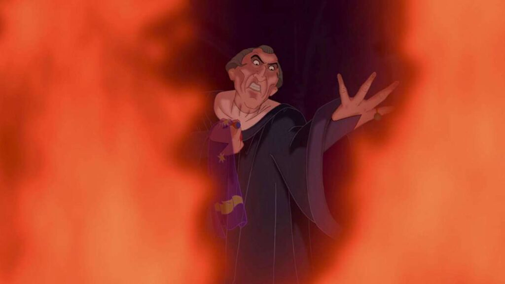 Picturing Javert in this moment, I immediately thought of the image of Judge Frollo from the Disney version of The Hunchback of Notre Dame in “Hellfire”: